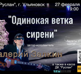 27 февраля в 19:00 в ДК «Руслан» Валерий Залкин — исполнитель с уникальным голосом, автор песен, любимых не одним поколением слушателей. Его знаменитая композиция «Одинокая ветка сирени» давно стала народной — её поют в караоке, исполняют на семейных праздниках и народных гуляниях. Также популярны его хиты: «Капали слёзы», «Иволга», «Алые розы». Эти песни звучат в