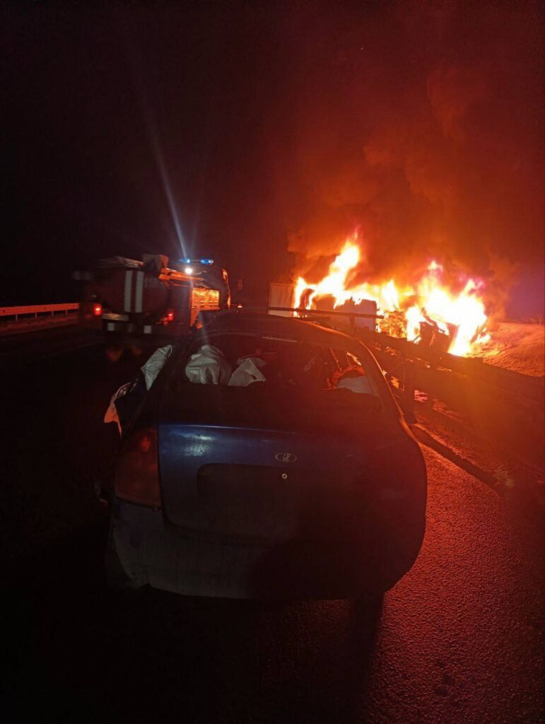 Водитель «Лады Калины» (мужчина 1998 года рождения) выехал на полосу встречного движения. Произошло столкновение с полуприцепом «Даф» под управлением водителя 1992 года рождения. После удара грузовик съехал в кювет и загорелся. На месте происшествия погибли три человека: водитель «Лады Калины» и две пассажирки.